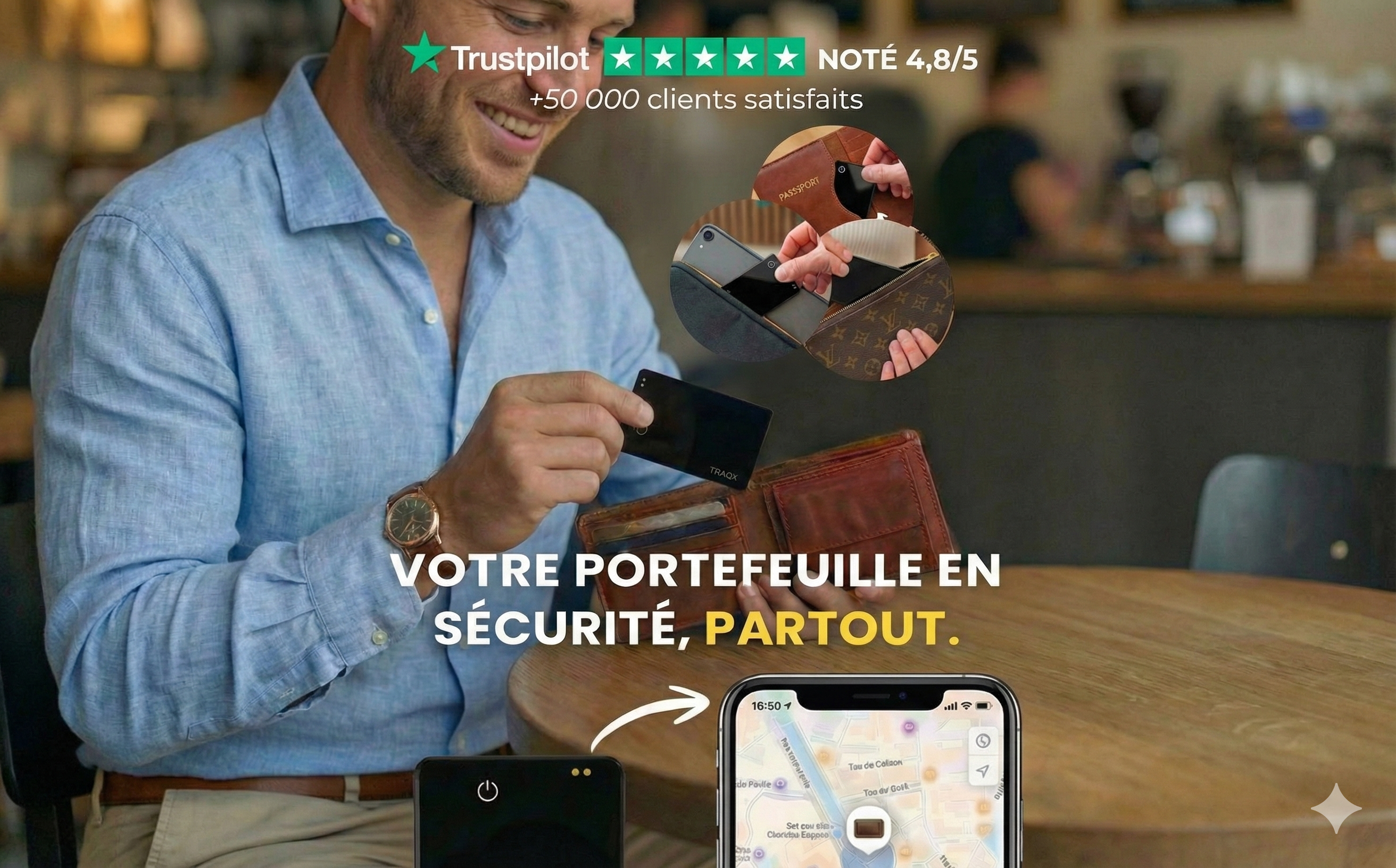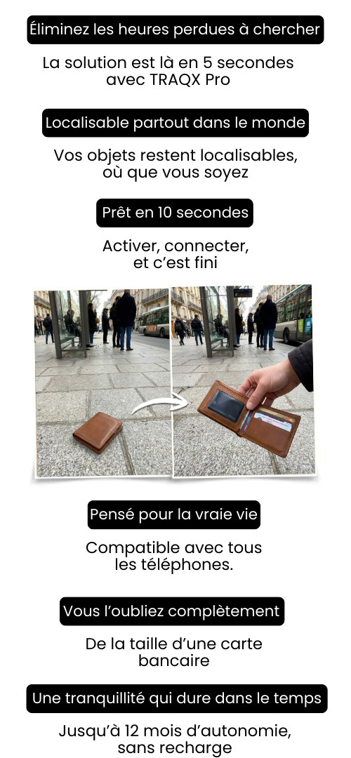 Avec son format carte ultra-fin de 2,2 mm, TRAQX Pro™ se glisse facilement dans un portefeuille ou dans vos affaires du quotidien.